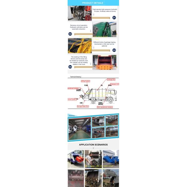New ribless box, beautiful plane arc, effective compression volume 10-12 cubic meters, tail with flip feeding mechanism, electronic control manual double control system, cab and rear double control box, tail with 3 cm rubber seal strip, With sewage collection tank, large-capacity sewage tank, the box can be painted as required patterns and words.